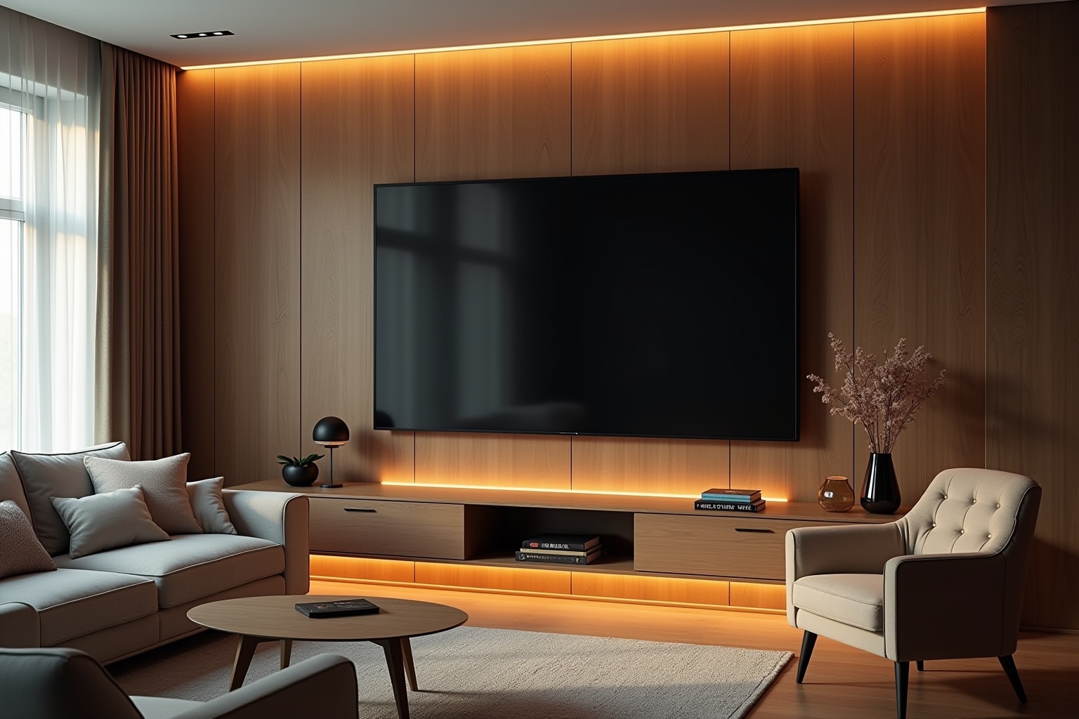 Beleuchtung: Indirekte Beleuchtung kann eine stimmungsvolle Atmosphäre schaffen und deine TV-Wand in Szene setzen. LED-Streifen oder Spots sind eine gute Wahl.